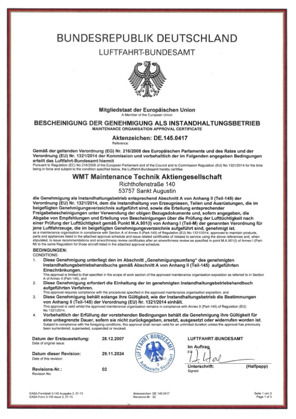 In Übereinkunft mit den Produktionsprozessen und –verfahren von Parker Hannifin/ Stratoflex Products Division ist WMT zugelassen und zertifiziert nach den Europäischen Luftfahrt-Richtlinien EASA Teil-21 & Teil-145.